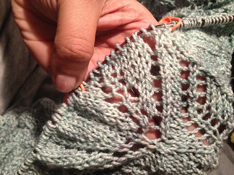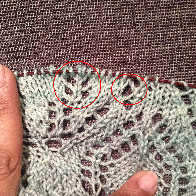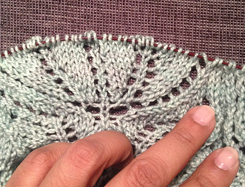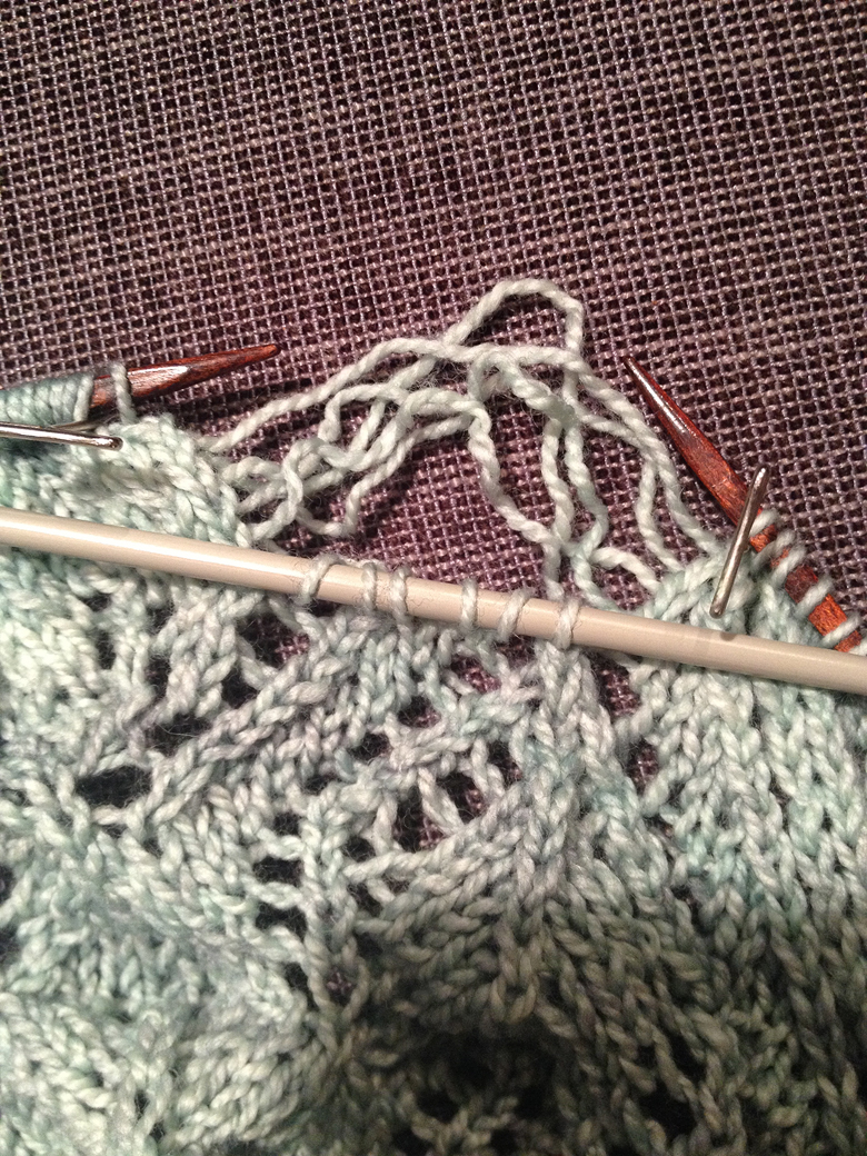 It’s tricky; you have to remember where your decreases were, and your yarn-overs so you can put them back in. You have to remember to add a row of plain knitting above the lace (the equivalent of purling back over the row), and you get seriously sweaty palms from the stress alone. In my case, the number of stitches I unraveled to was not the number I needed to have back on the needles at the end because of the increases in the intervening rows, so being able to read your knitting is a must.