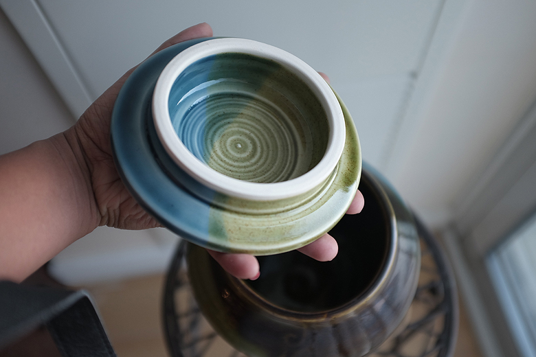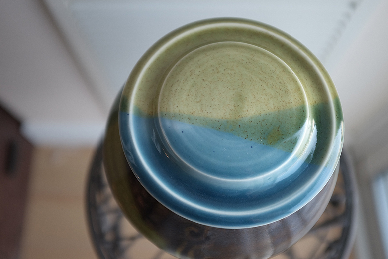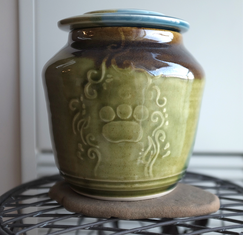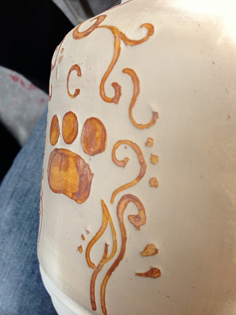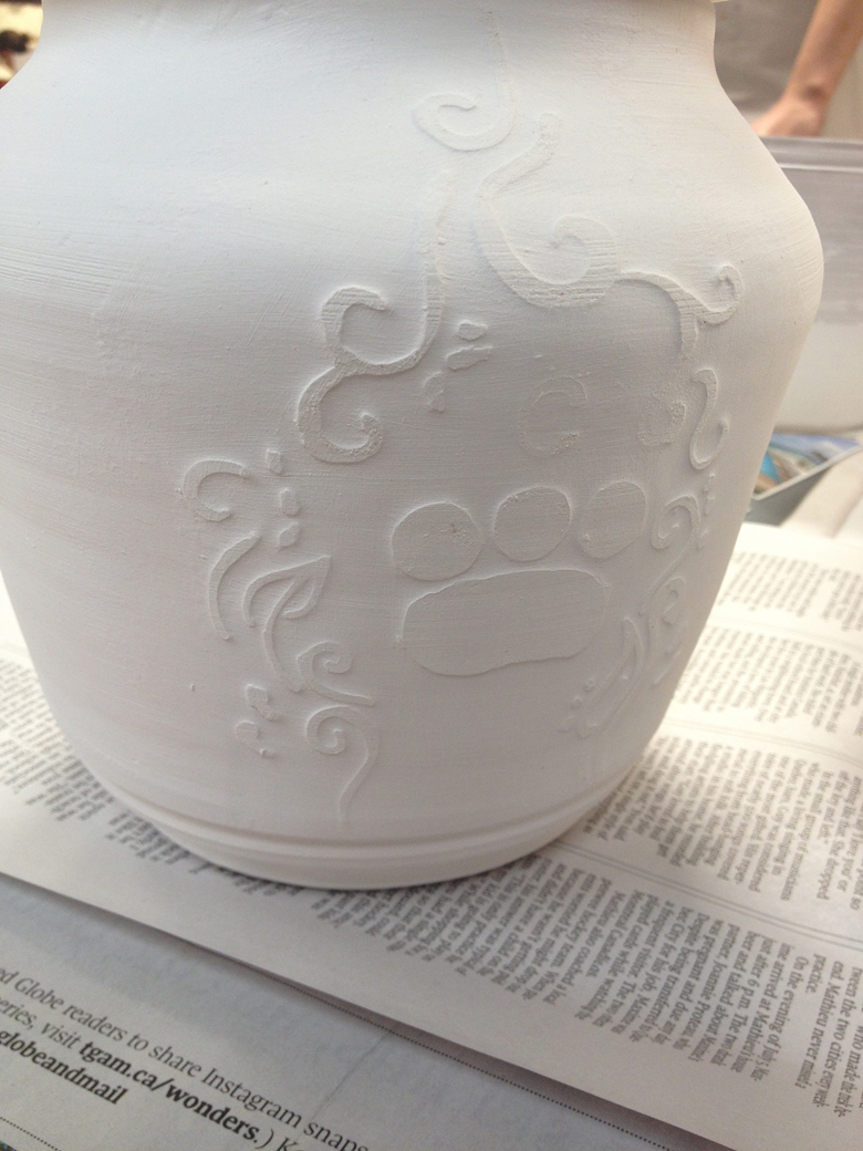 After the piece was thrown, I used a shellac technique to get the relief in my design. It’s very simple, using ordinary shellac, you hand-paint a design onto a bone-dry piece of pottery.