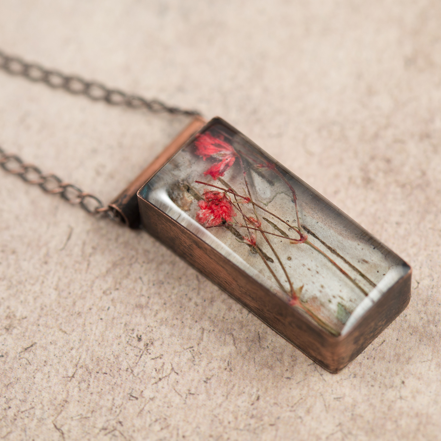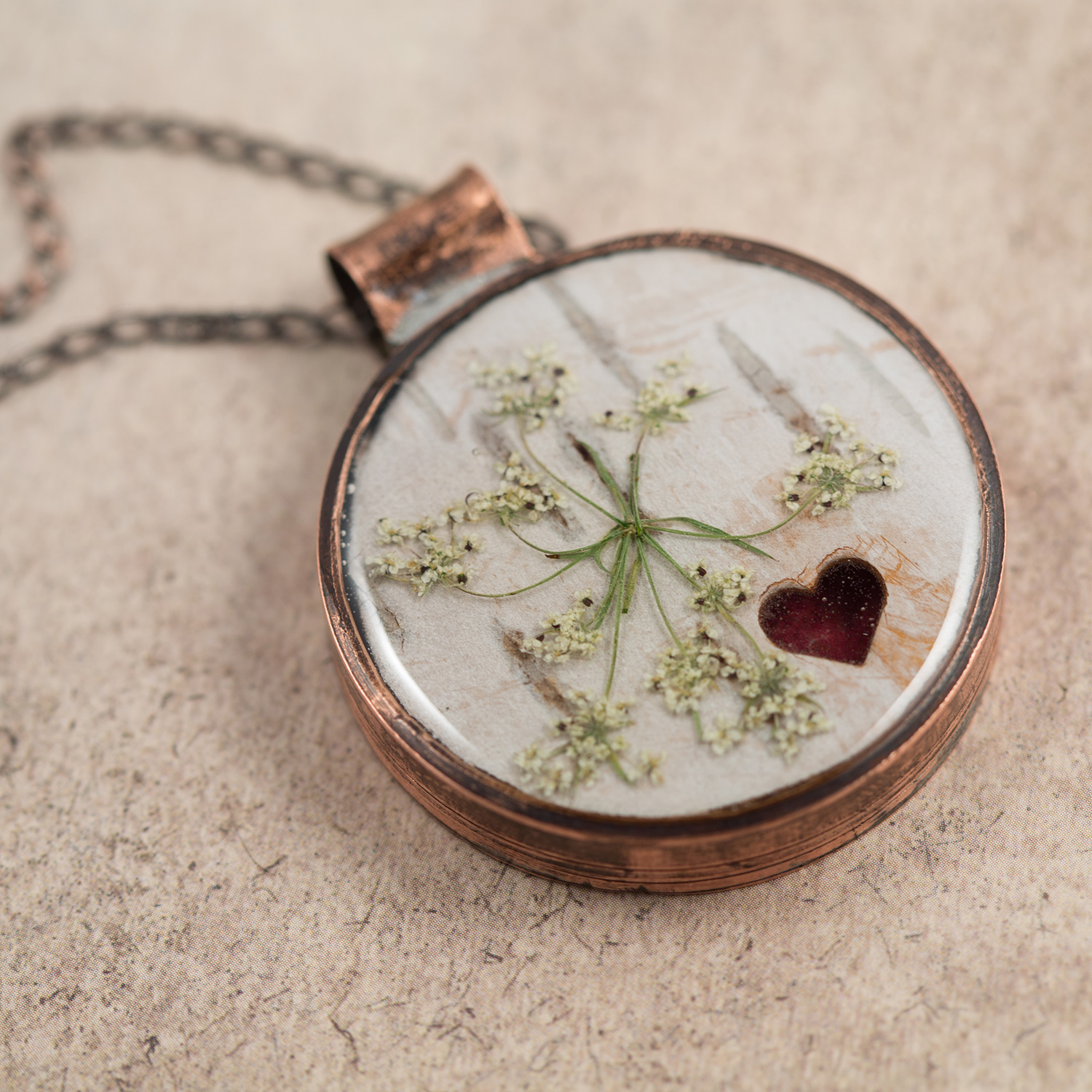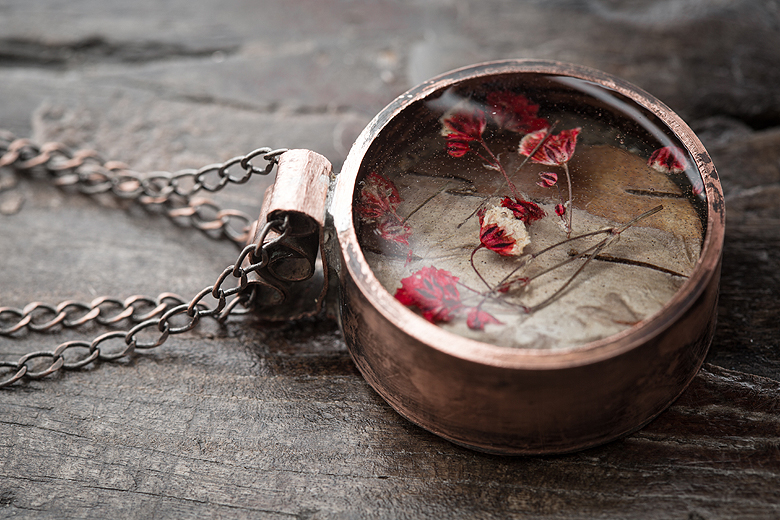 They’re pretty steampunk, with deep blue hydrangeas, forget-me-nots, baby’s breath, birch bark, Queen Anne’s Lace and maple leaves all in the mix. Transparent bezels, shadowbox effects and a double chain piece all make an appearance in the sale on Friday at noon. There are only 9 precious pieces; we went for time over quantity and really spent time on multiple pours, hand polishing and looking after the little details that make each one special.