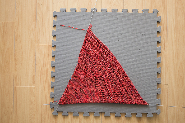 It’s kind of a nifty construction – you work flat as though building a semi-circular scarf and then join in the round to knit the cowl. This is how I blocked mine – with the result that my cowl came out with a point at the front and back that was not intended by the original design.