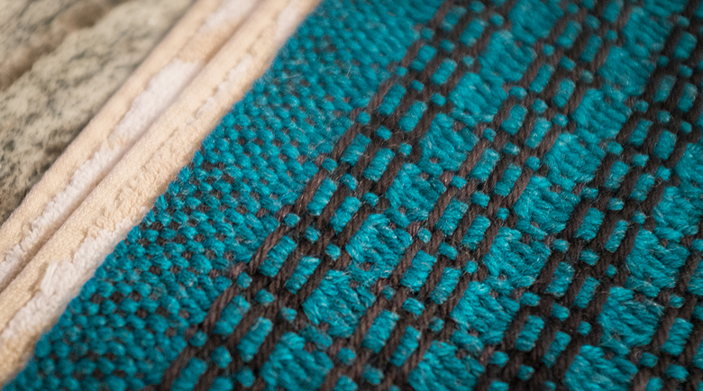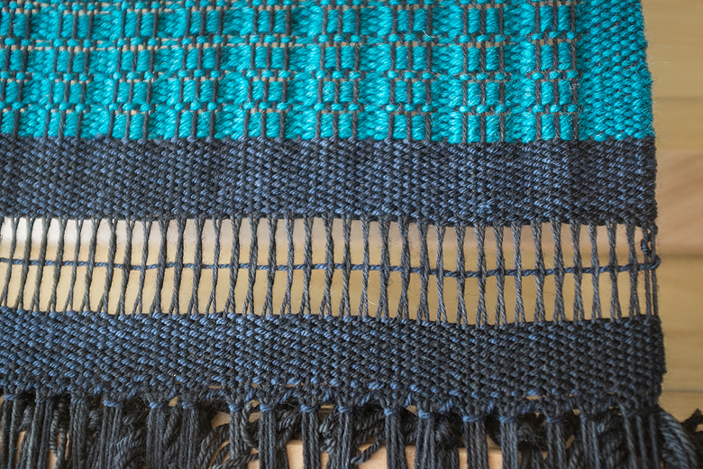 I wove 20 picks of plain weave with scraps of navy blue yarn, and hem-stitched my edge before continuing. To dress up my edges, I’m using 2×2 Leno on an open shed, which is a fancy pants way of saying that I twisted the bottom warp threads over the top and ran my weft through them. Changing the shed and running your weft back locks the twist in place.