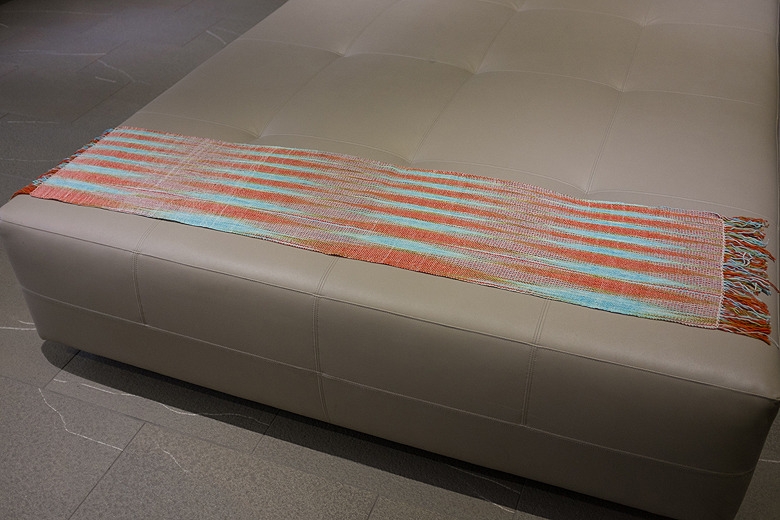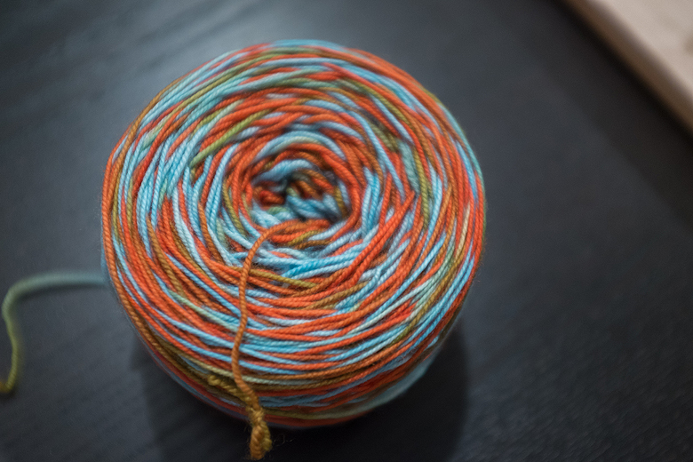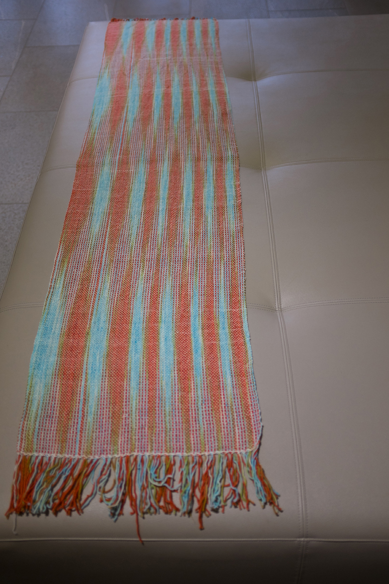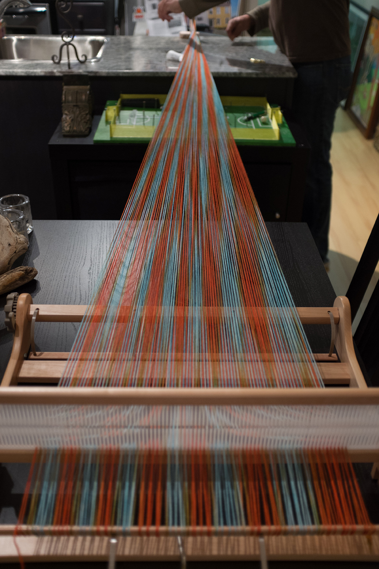 I decided to test drive ‘Crazy Talk’ by warping up a skein of ‘Crabby McHappypants’ from Blue Moon Fiber Arts Socks that Rock. It’s a palindrome skein, so Tito and I warped it with a slight offset, so the colours would shift across the length of the scarf.