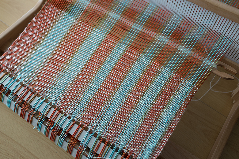 For the weft, I’m using Misti Alpaca lace, and beating it in very loosely. I warped up 16 inches, almost the full width of the loom.