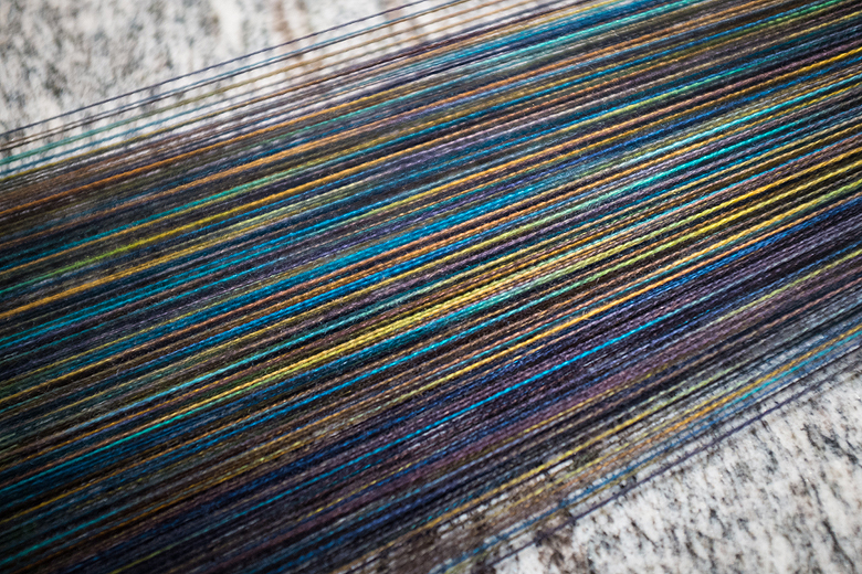 Onto the yarn! I am using a skein of Tanis Fiber Arts pink label (1000 yards) for both warp and weft. I wanted to see just how far I could push that one skein, so I warped up for a 16 inch wide, 6 foot long wrap. The colour of the yarn is one of Tanis’ newest creations, ‘Aurora’. It’s almost as hard to photograph as the real thing – the yarn is so varied and subtle that I feel like I didn’t do it justice here. Even the warp was stunning.