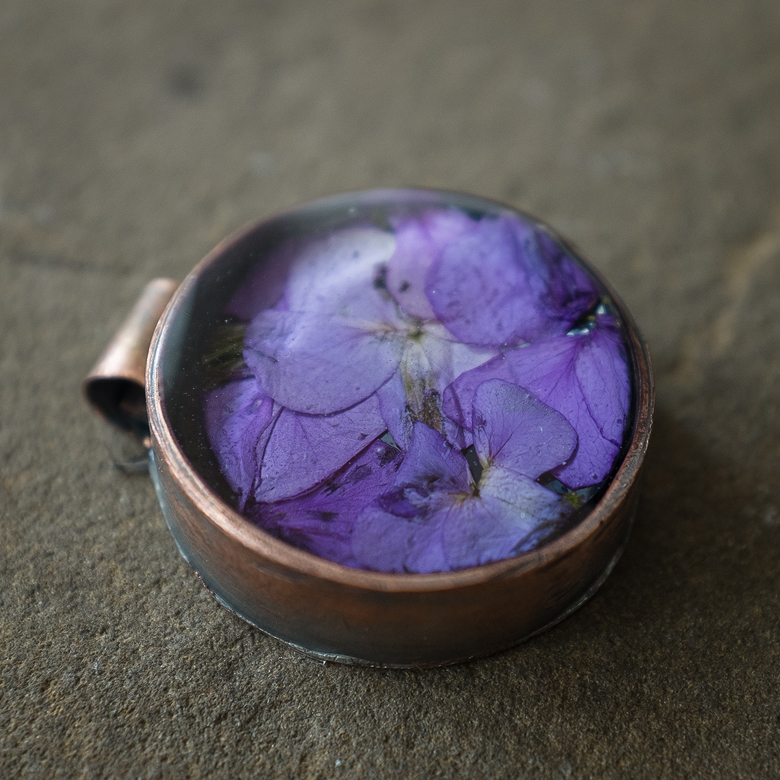 This year, because we’ve been doing so much jewellery and resin work together, we’ve decided to enter the show as a team; Tito preparing the bezels and helping with drilling and sanding and me looking after the preservation of the flowers and the resining of the work. The photos here are a sneak peek of our ‘pinks & purples’.