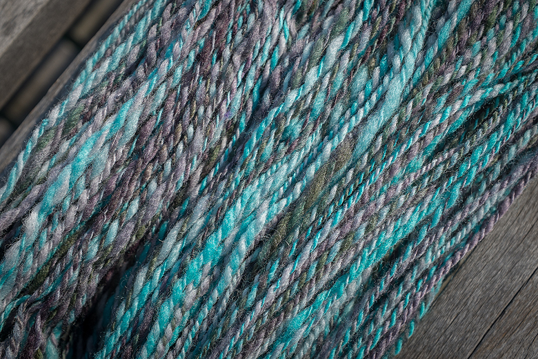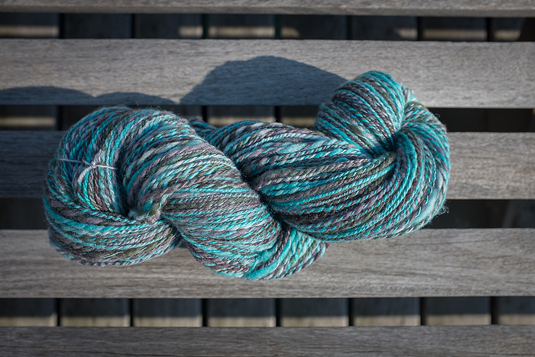 It’s 4oz. of merino top called ‘Peggy’. I’m not sure if this is a characteristic of the fiber, or if it had felted slightly, because it was very hard to draft. I felt like I was manhandling it, and shamefully pre-drafted nigh to pencil roving thickness in order to get a consistent thread from it.