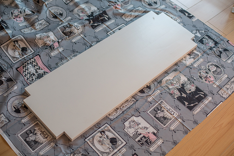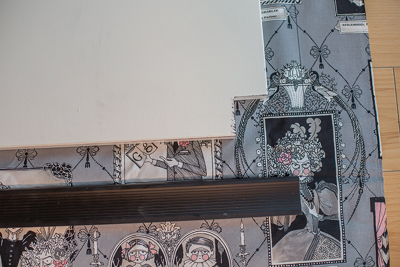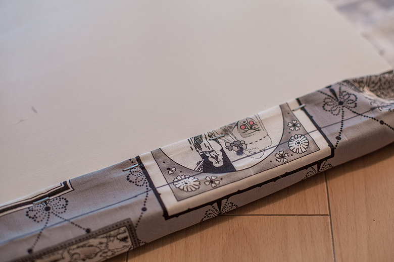 Then I chose my fabric cover. This is an adorable Edward Gorey’esque print that I purchased at Log Cabin Yardage last summer, and it’s been sitting in my stash waiting for just the right project. I lay the cover down on top, being careful to keep it level with the artwork in the print.