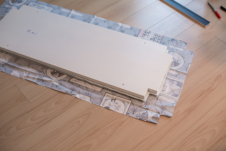 I folded the sides so they were double thick, and used a staple gun to secure them in place. It’s helpful if you remember to mark where the hardware holes are as you go along so you don’t need to hunt for them when you’re adding the side panels back on.