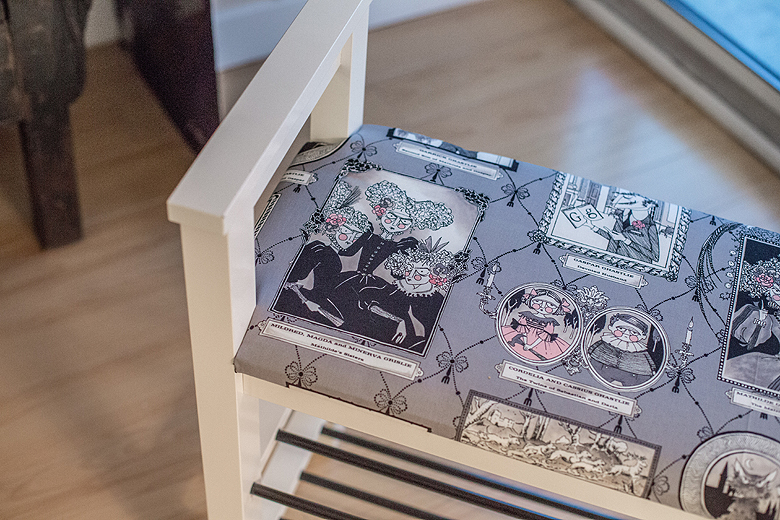 Tito and I bought a shoe rack/bench from IKEA for our front hall a few months ago. It’s a nice rack, but it was missing that element of quirky creativity that defines our home, and last night we decided it would be fun to add a customized, cushioned seat cover. It’s super easy, here’s how we did it!