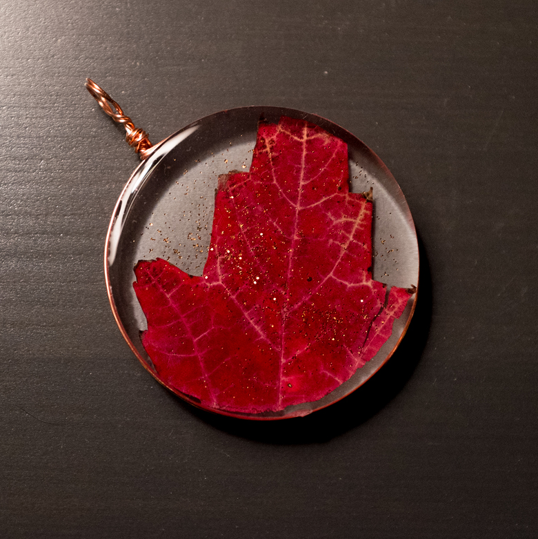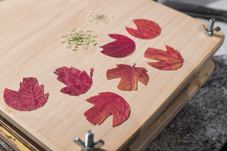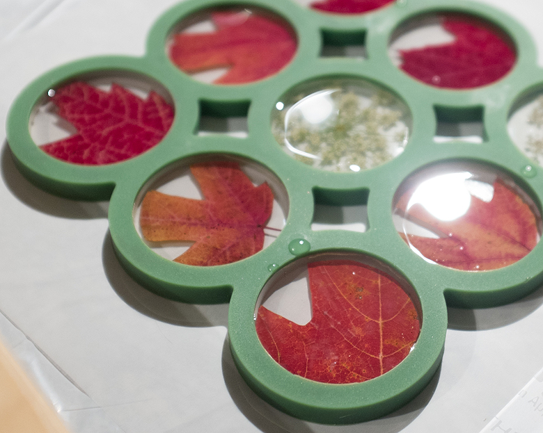 4. When the first layer of resin is about 2-3 hours old, press the leaves gently down into each circle. Mix up another batch of resin and add another layer, just 1-2mm thick, to seal the leaves in place.