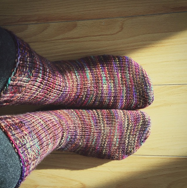 I knit myself selfish, straightforward, fall-off-the-needles, DK weight socks in a beautiful variegated yarn called ‘Tartan‘ from Tanis Fiber Arts. They are thick and smooshy and the colourful yarn made them a pleasure to knit. 2 days to complete. Yep, 2 day socks.