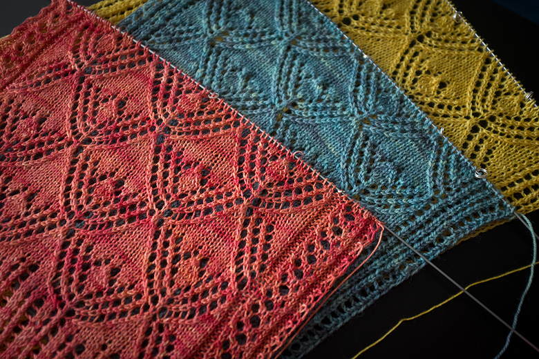 The yellow and blue ones are prototypes, but I wasn’t happy with the side panels (see how it’s kinda ragged at the bottom corners of the yellow one?) and the blue one has a different border entirely that just wasn’t working out for me. The blue one also has the drawback of coming from a 420 yard skein, and a little math told me it would not yield a shawl that was long enough for me.