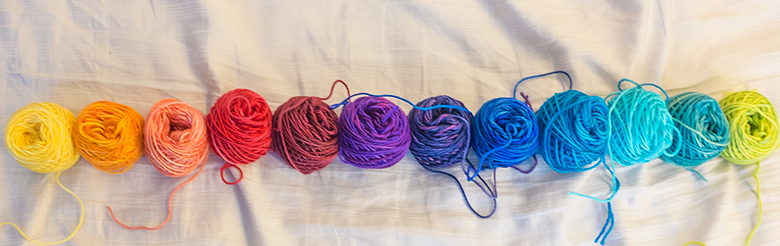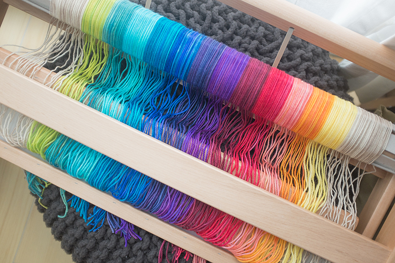 2. Wind up the yarn into little balls and work out the order that you’d like your colours to appear in the warp. I went for something close to a natural spectrum. You will use one ball of each colour for your warp, and one ball of each colour for the weft, so keep the 2 sets separated.