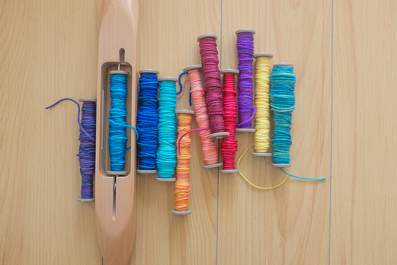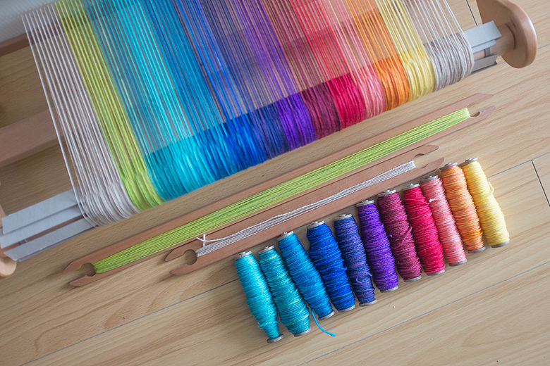 *Most looms come with stick shuttles, but because you’ll be changing colours frequently, a boat shuttle with enough extra bobbins to give you one bobbin per colour is much easier. Also, a boat shuttle gives you a smoother pass through the shed, and because the bobbin spins freely it doesn’t do that awful snag thing when you’ve passed your stick shuttle though without a long enough length of yarn. If you enjoy weaving, it’s a worthwhile investment.