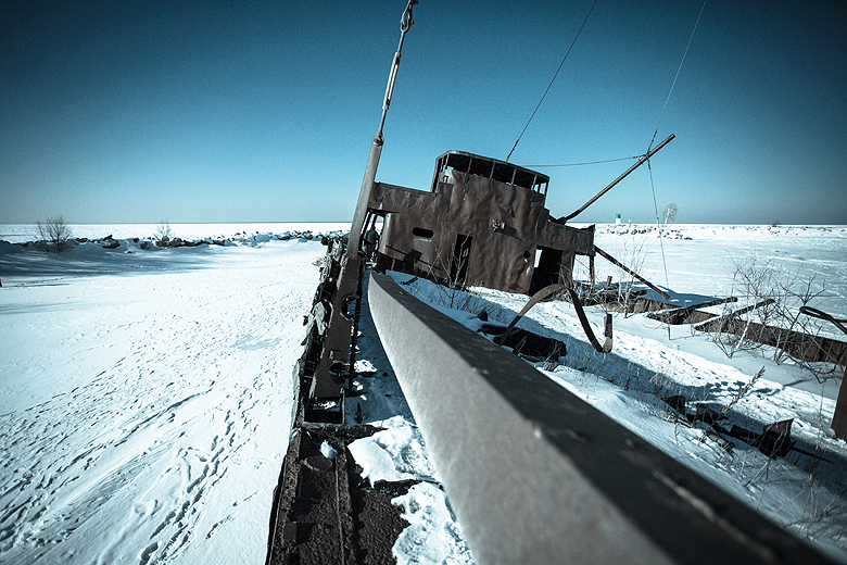Last weekend, on our way home from the frozen Niagara Falls shoot, Tito and I decided to make one more stop before Toronto, and pulled off at the Jordan Station shipwreck to see what it looked like in the deep freeze. We’ve shot this old wreck before, here is a shot I took in the summer: