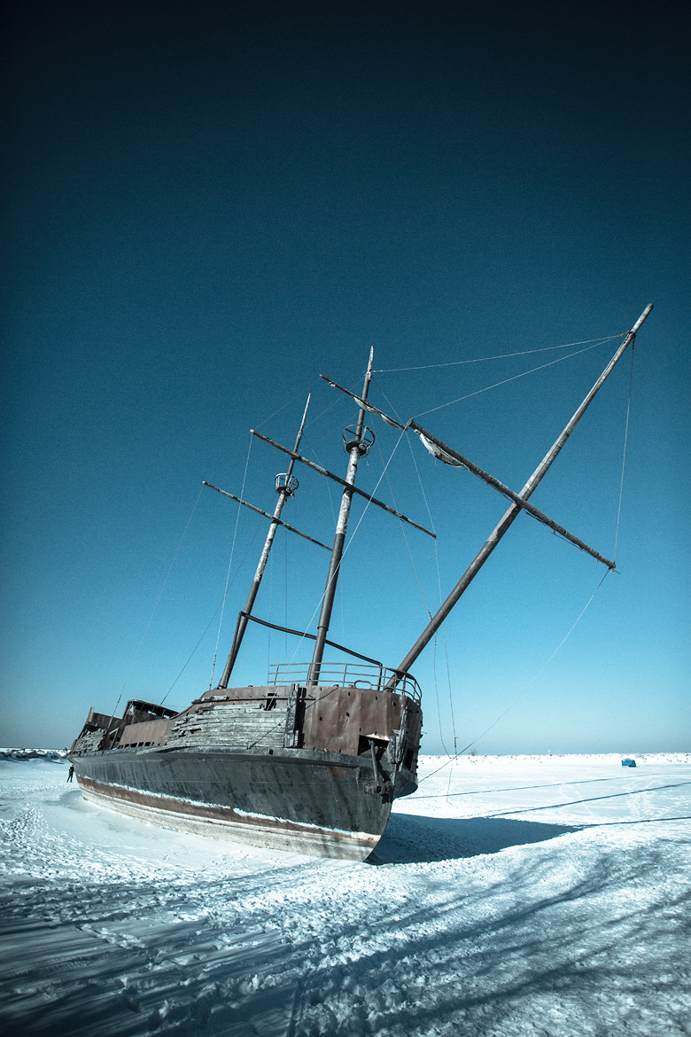 It was solid enough that there were ice fishing huts on the water, so we knew it was safe enough to get closer, and to even climb onto the ship itself for the first time.