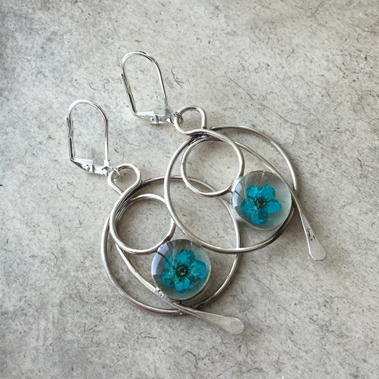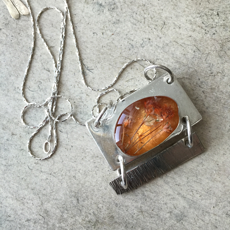 We’re really focusing on sterling silver these days. As much as I loved my older pieces, I really feel like Tito’s involvement has raised the game in a huge way. I used to buy commercial bezels, but handmade bezels make all the difference. Each piece is truly one of a kind, and I love his design aesthetic. Check out our latest goodies in sterling silver with viola, pansies, pink nigella and birch bark!