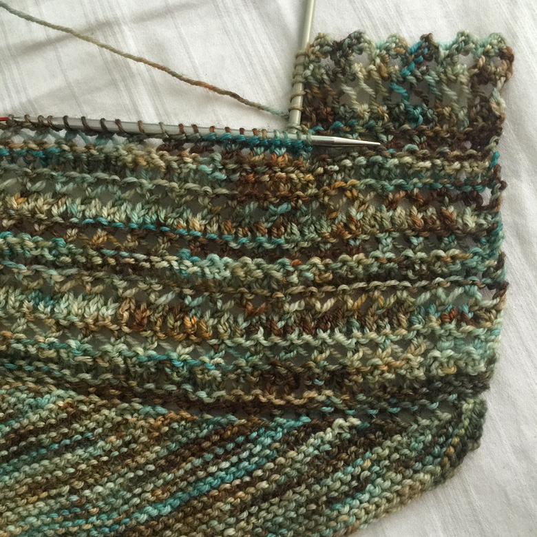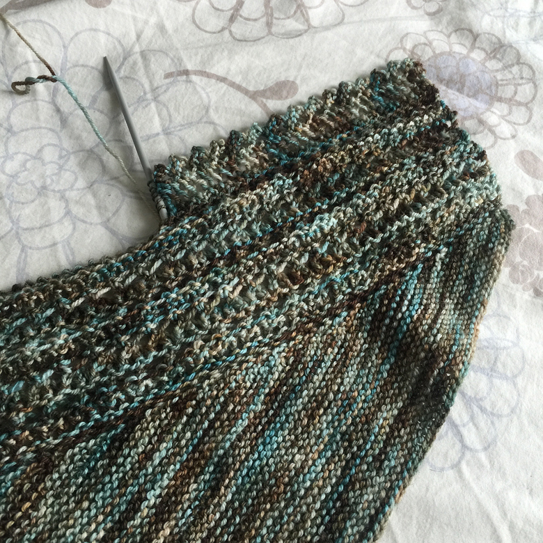 I mean, is there any progress at all there? Can you tell? Spot the difference? I feel like I’ve entered a knitting time warp. I shall persevere though, because it’s working out to be one cool, wet summer and I really want this shawl!