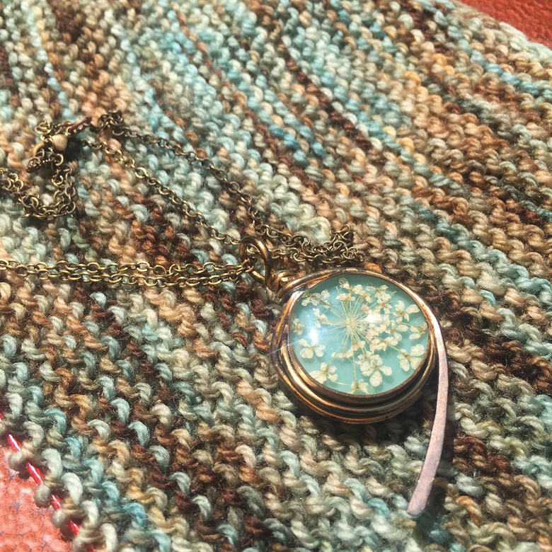 Shown are 2 very similar colour ways; ‘Tut Tut, Looks Like Rain‘ and ‘Sand and Sea Glass‘. I bought sock and lace weight (perhaps another featherweight cardigan?) and I loved them even more in person. I especially love that she ties a little stitch marker to each skein – so cute!
