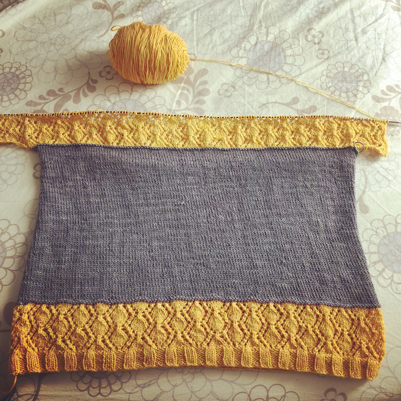 I’ve really had the design bug lately, and my latest is finally starting to take form! As soon as I saw Tanis Fiber Arts’ new colours, Graphite and Saffron, I knew they had to appear together in a garment, and so the ‘Leslie’ top was born.