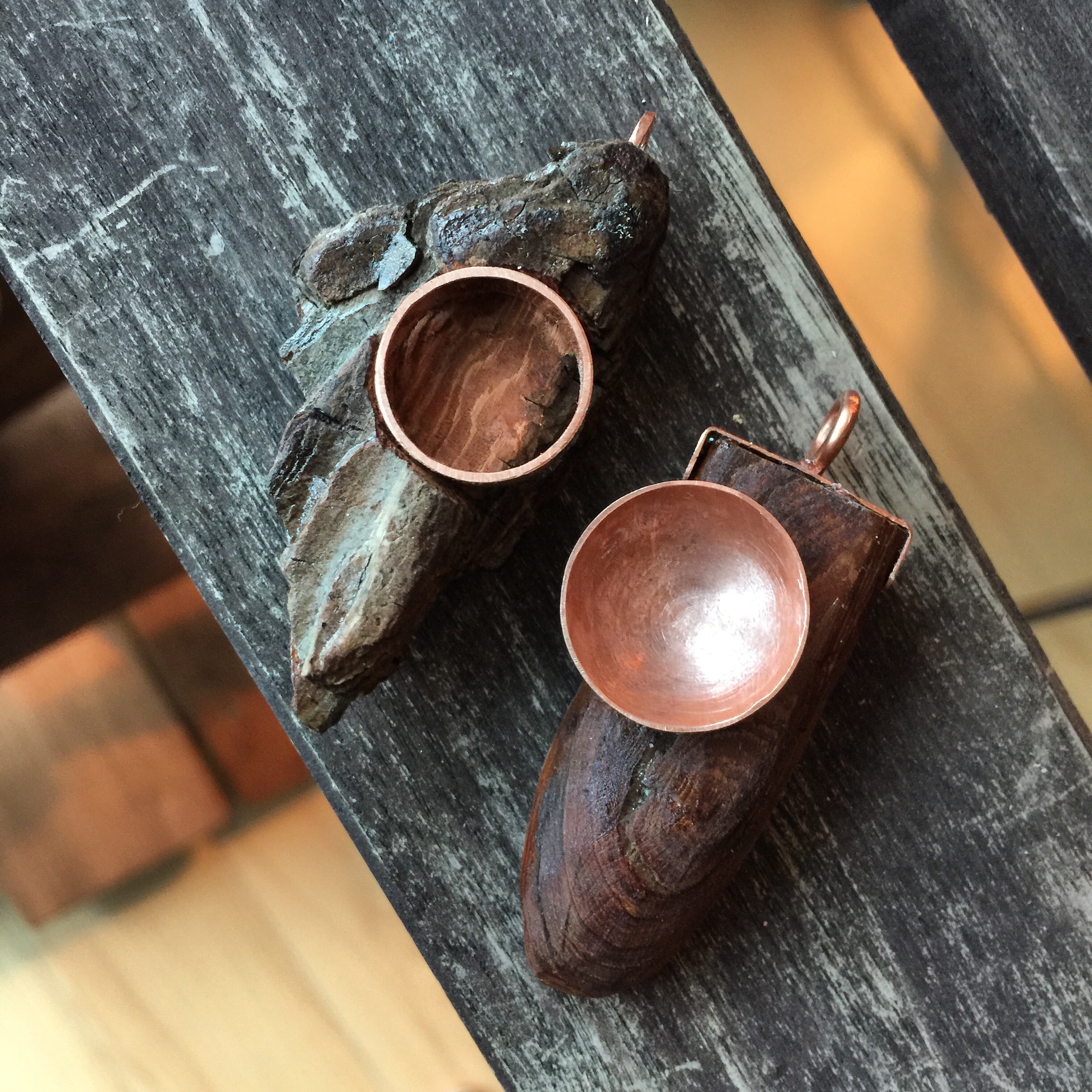 In the spirit of taking our jewellery/nature fusion one step farther, Tito has designed these beautiful bezels using copper and small pieces of bark and driftwood. Can’t wait to add flowers and resin and see the overall composition!