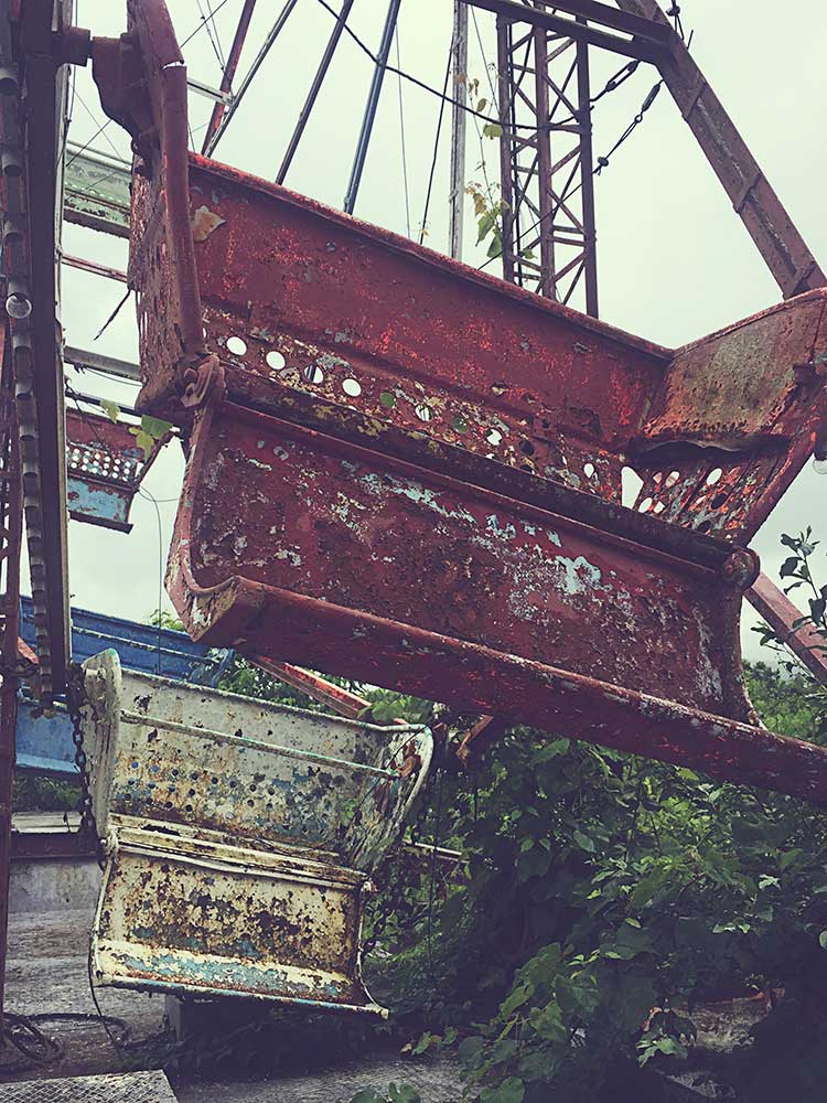 On the way back from Georgia last week we passed by this abandoned park, just off the 1-75 in Tennessee. I didn’t have anything but my phone camera handy, but you know I had to stop and check it out! There are 2 rusting ferris wheels, a huge model rocket, a clown sign, something called the ‘patriotic palace’ and probably a few other tidbits that I missed in my hasty tour. All of it is being reclaimed by nature and it’s literally right off the highway. A quick google search revealed nothing about the park, but it had a great, creepy vibe to it, especially on such a glum, rainy day.