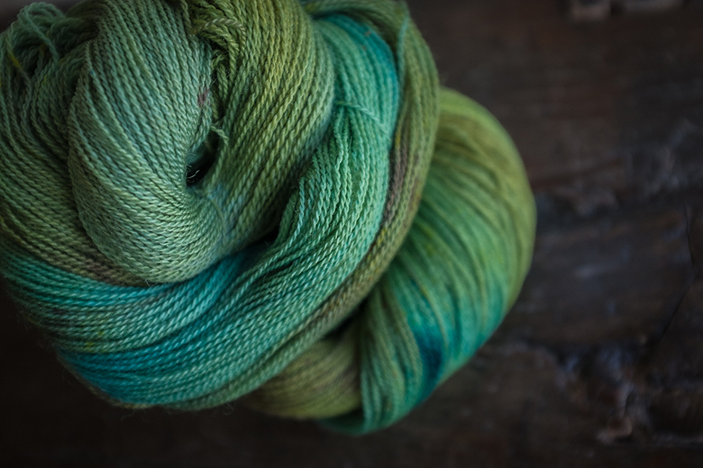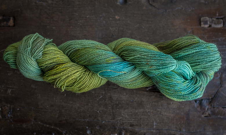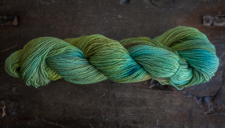 This particular yarn is 600 yards of light fingering/heavy lace to 100g. It’s an 80/20 merino/nylon blend with good durability, and it takes the dye beautifully.