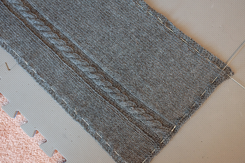 To really get all that stockinette to lay nice and flat I soaked it (in Soak, of course) for about 20 minutes to really saturate the fiber and then used blocking wires (see photos) to open the piece up.