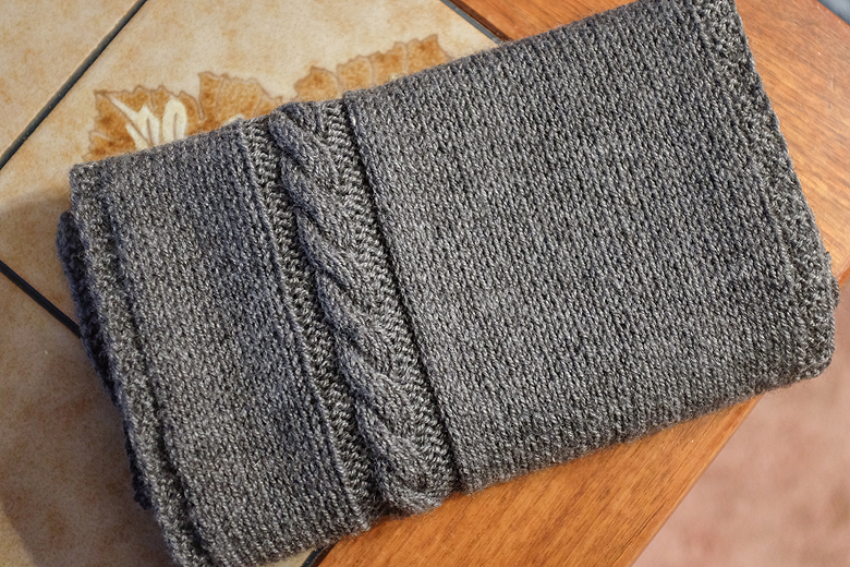 A few notes on construction – the slipped stitch at the beginning of each row was to give the piece a nice attractive selvage. The ‘purl through the back loop’ instruction twists the stitch immediately following the cable to keep it nice and tight and eliminate that horrid ladder that occasionally can happen with cables. If this is not your thing you can ignore that bit; just give your yarn a little tug after the first purl and the results will be the same. There are 4 stitches of garter at each end to keep it from curling.